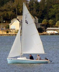 Here is a picture of a our Hobie in the Scarborough town harbor close to shore near our shop. Its an ideal spot for a low stress and easy sail. The Bravo is 12 feet long and has one sail. It is the easiest of the Hobie Cats to sail with room for two and a capacity of 400 pounds. It draws (requires) only one foot of water and can be sailed almost anywhere in the harbor or close by in the rivers The cost is $50 per hour with a two hour minimum, $125 for three hours, $150 for a 6 hour day, or $450 for a 6 day week.